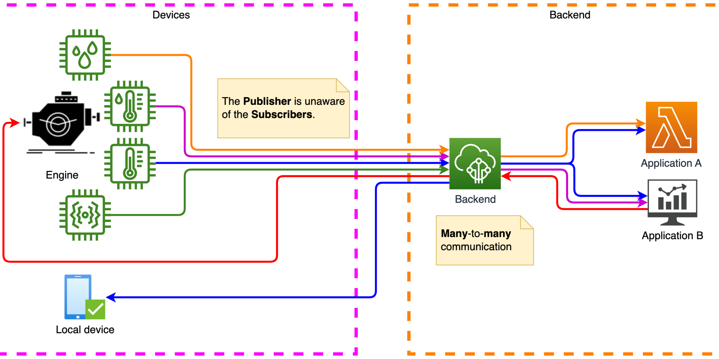 Many-to-many communication is a hallmark of MQTT, enabling ecosystem capabilities. The IoT ecosystem is a dynamic group of loosely connected devices interacting to realize various business use cases. Introducing a new device increases the overall value of the solution by allowing it to: